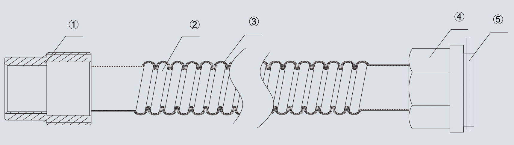①G1/2 meter pipe external wire connector ②SS304 stainless steel spiral corrugated pipe ③PE coating ④M30×2 meter tube anti-theft inner wire connector ⑤Buckle |
