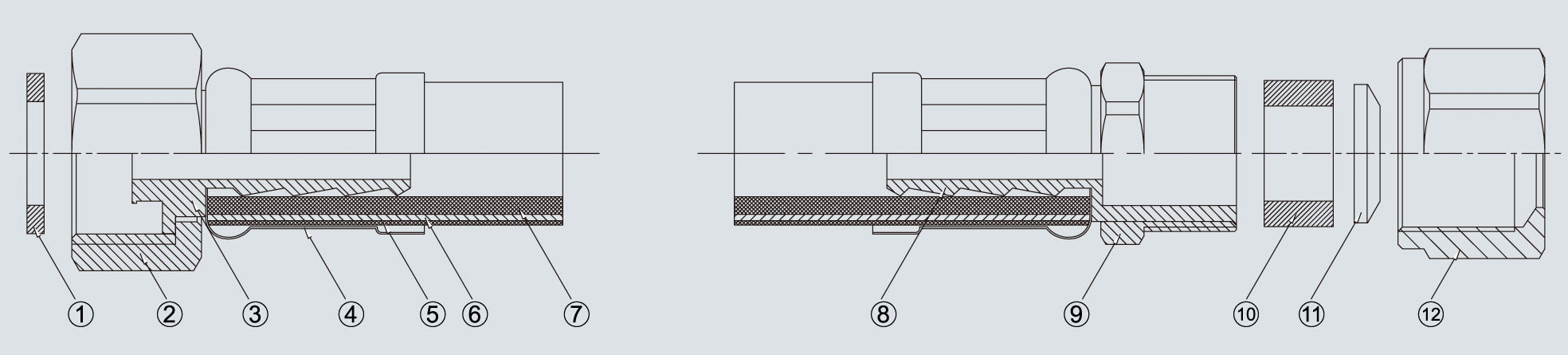 ⑧喇叭口接头⑨M18×1插入式外丝⑩垫圈 ⑪塑料绝缘垫圈②M18×1插入式内丝